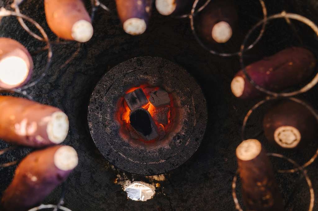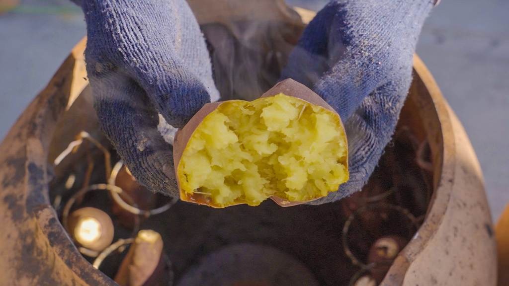 直火を当てずに壺の中でじっくりと蒸し焼きにすることで、さつまいもの甘みを最大限に引き出します。